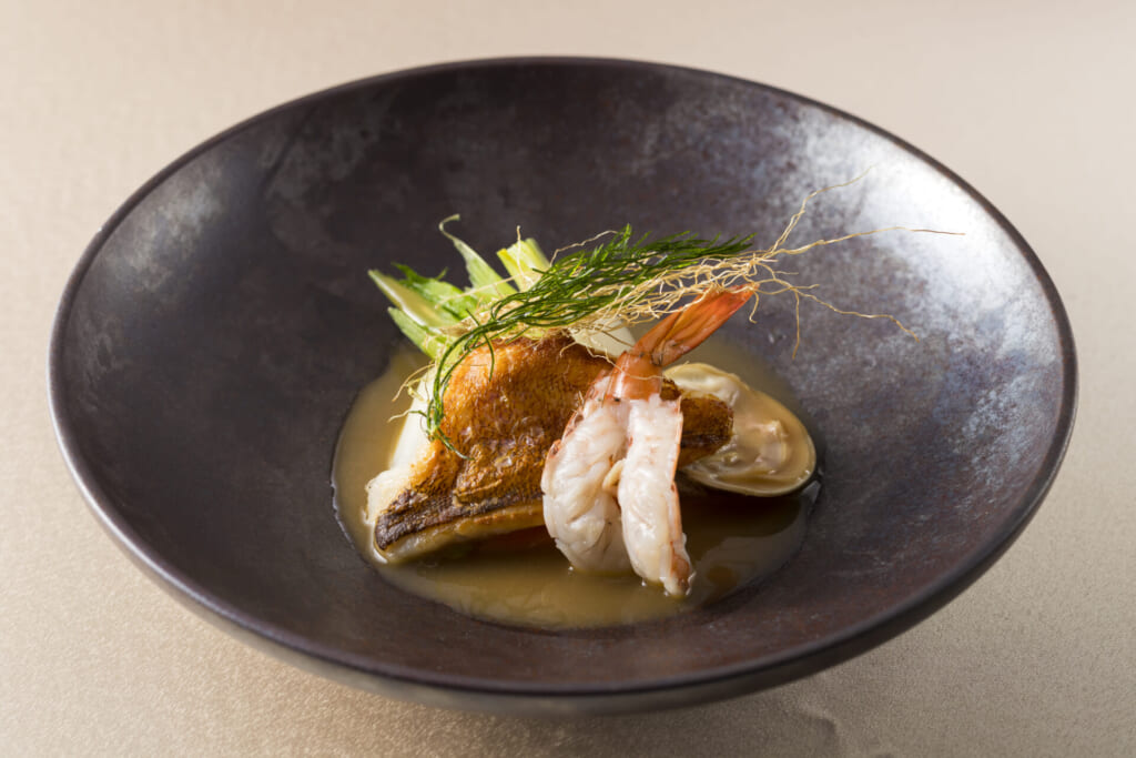 ドライトマトで香り豊かに仕上げた熟成魚のローストや、季節の味覚を華やかに仕立てた前菜など