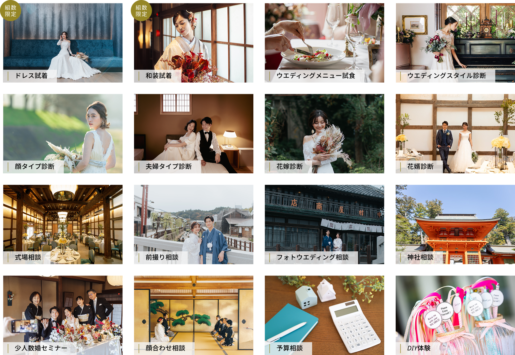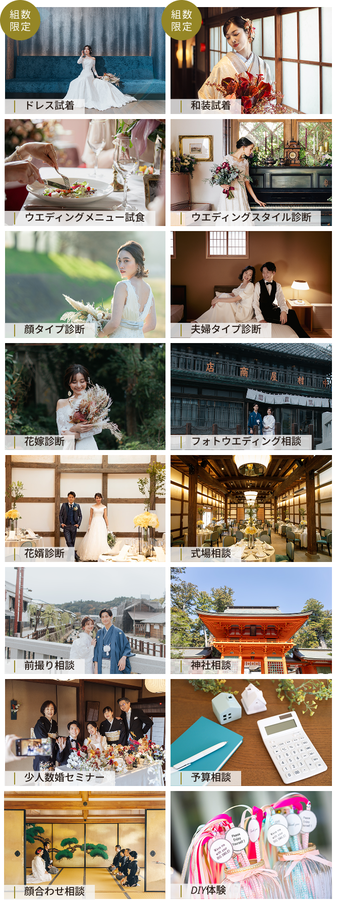 ドレス&和装試着・ウエディングメニュー試食・式場相談など、結婚式準備にまつわる体験と