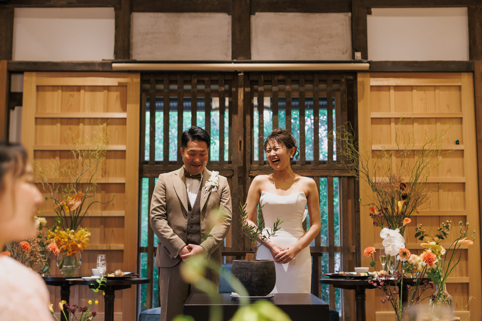 ご家族やご友人が見守る中、落ち着きと華やかさを感じさせる和の趣に包まれた人前式はあたたかい一体感に満ち、おふたりとゲストの皆様の深い縁を感じる穏やかな挙式となりました。
